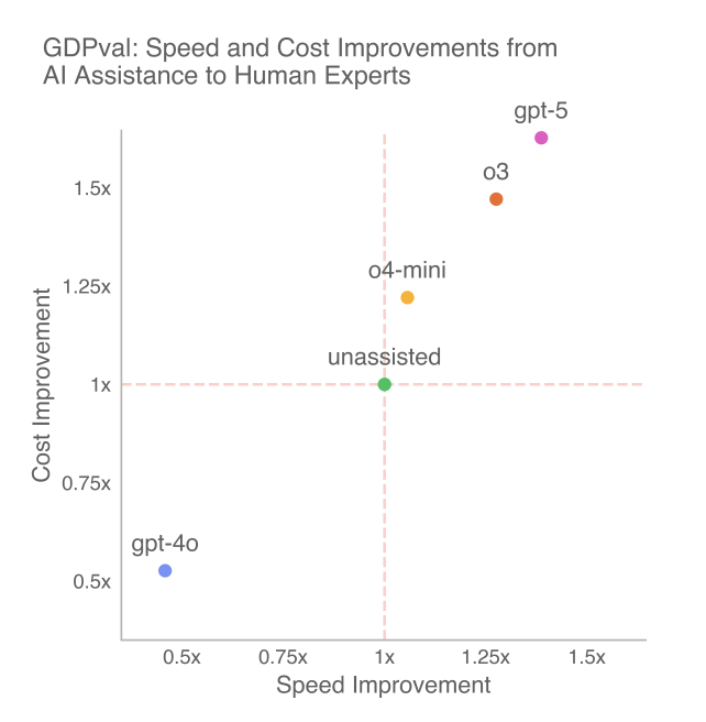 从GPT-4o(2024年春发布)到GPT-5(2025年夏发布),模型在GDPval任务上的平均表现几乎翻倍,呈现出明显的线性进步趋势。