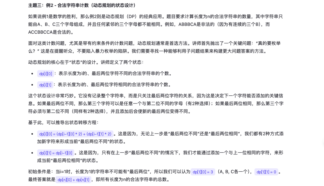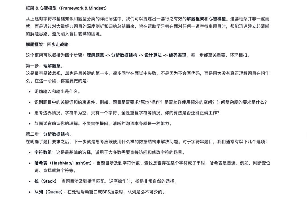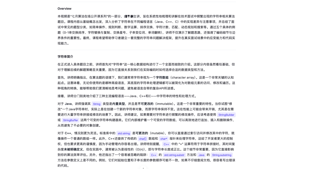 Qwen3-Omni给出了摘要,抓住了老师在课程中反复强调的观点,并且用非常清晰的逻辑结构,把它们组织了起来。对于视频中提到的字符串、面试题总体分析(概念理解、规则判断、数字运算、排序与交换、动态规划、搜索等)都有了。