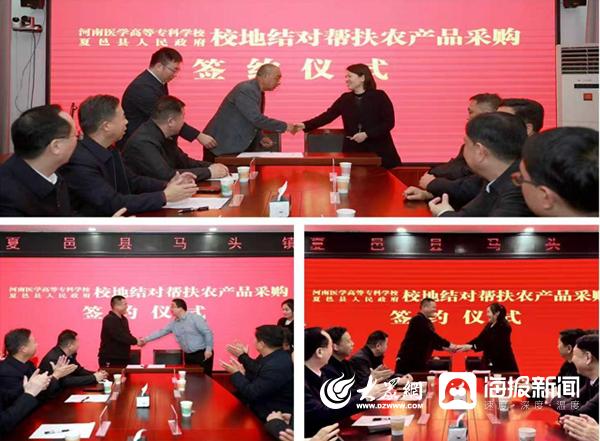会上,学校相关部门负责人分别与马头镇政府、夏邑县鸿强中药材合作社签订科技帮扶协议利赢汇,与当地商户签订农产品采购协议。